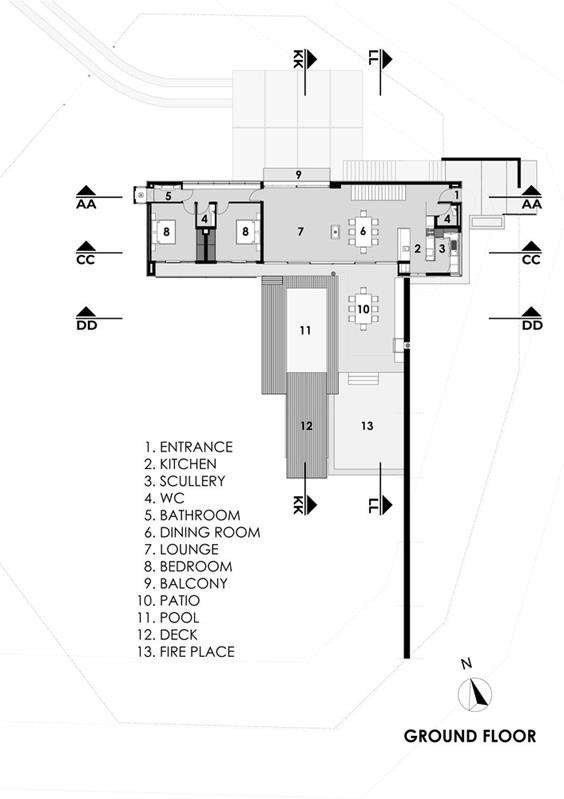 A limited range of finishes are used both indoors and outdoors. Wood-grained concrete walls are offset by ventilated steel cladding that rusts over time and gives a beautiful reddish finish. Other concrete features include cantilevered concrete stairs, polished white aggregate concrete floors used throughout the house, and polished concrete vanity tops. As used throughout, a rusted mesh column. Flowing solar power generation systems provide power to their own applications, and the node face roof window has sunlight for penetrating the southern / attraction of winter.