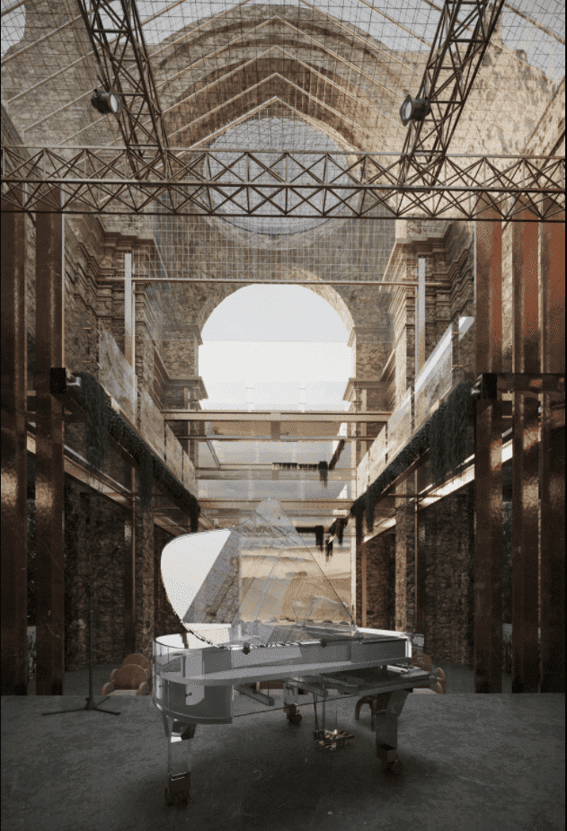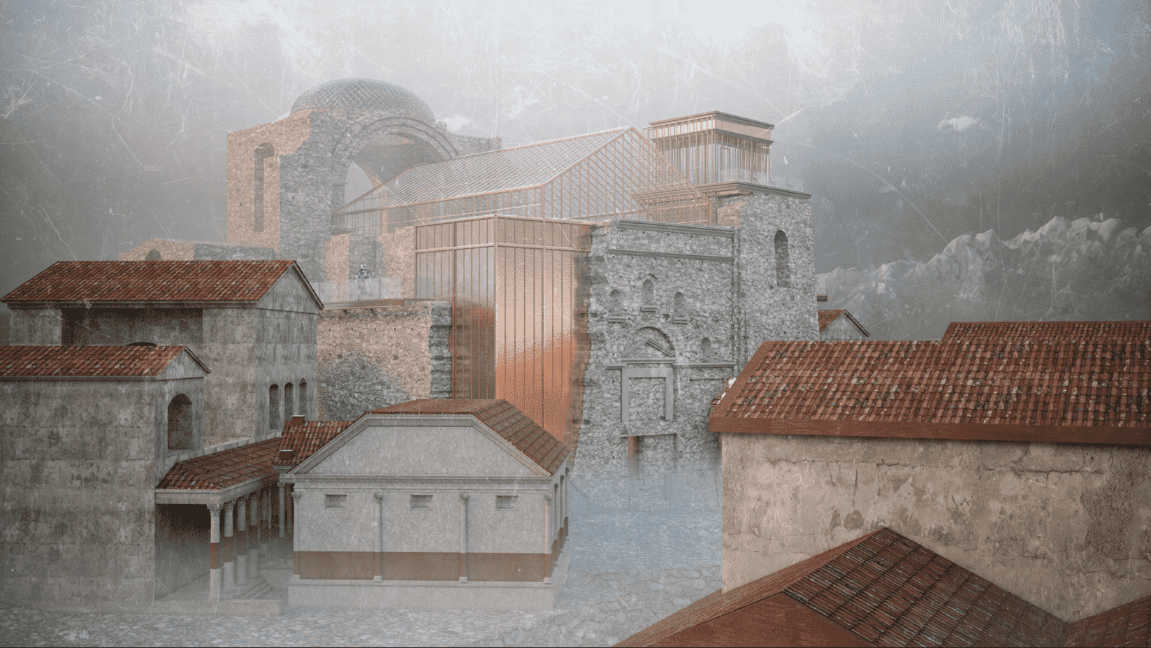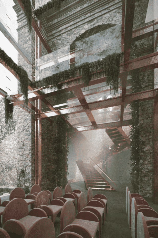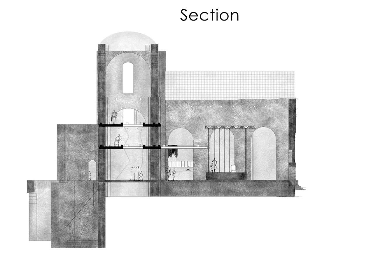 The idea consists of regenerating the space and preserving the spirit of the place of the Italian town. We chose the method of devizualization of the new architecture, using translucent and reflective planars. They complete the look of the church, by standing in the background and giving all the attention to the authentic church. Thus, the new construction become a "ghost building" because of using glass to create the effect of dissolving into space, and filling the pause in the context of the urban space. All the main ruined parts - the roof, the walls, vaults, and arches became visible again but now only in the glass and copper to show the contrast of old and new but in the same time to save the essence of “genius loci”.