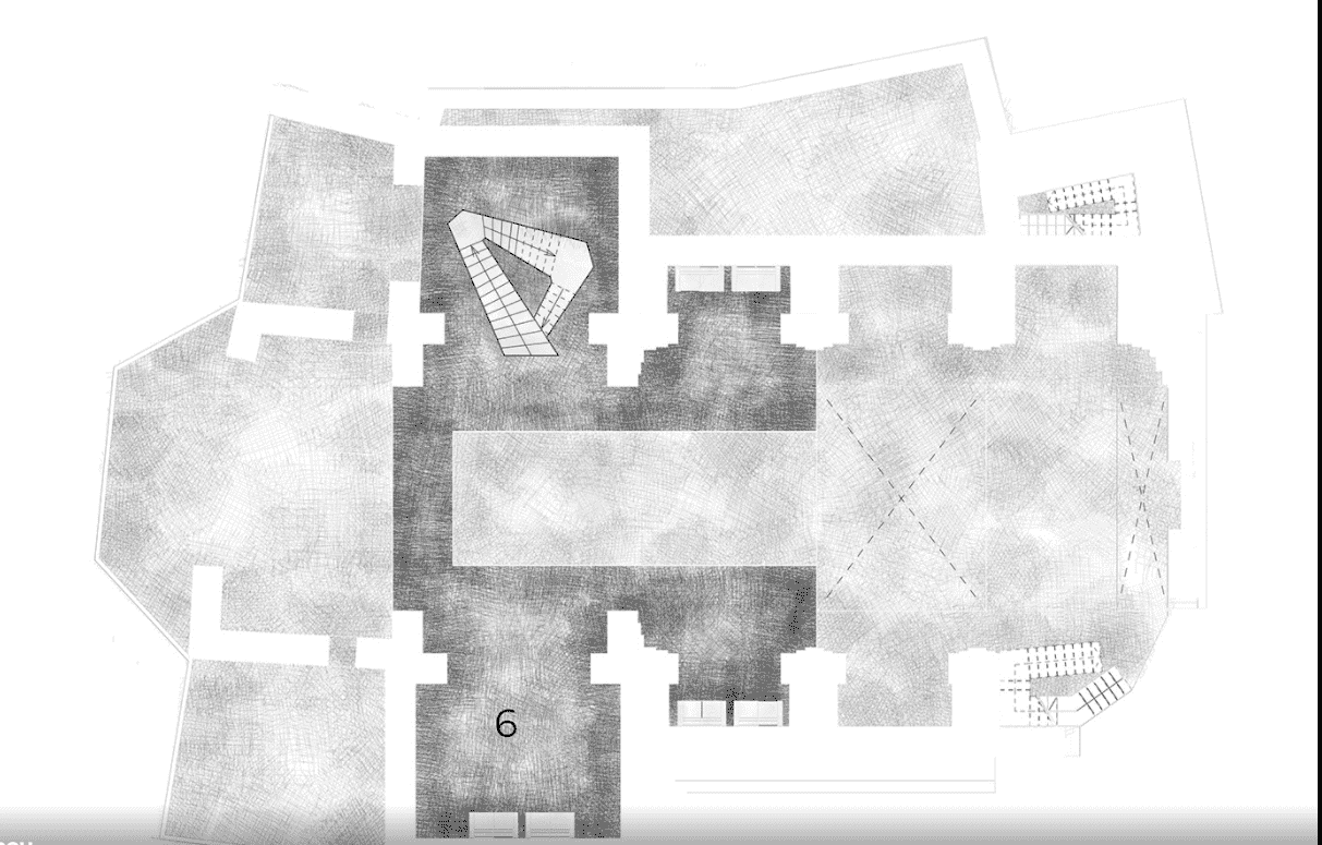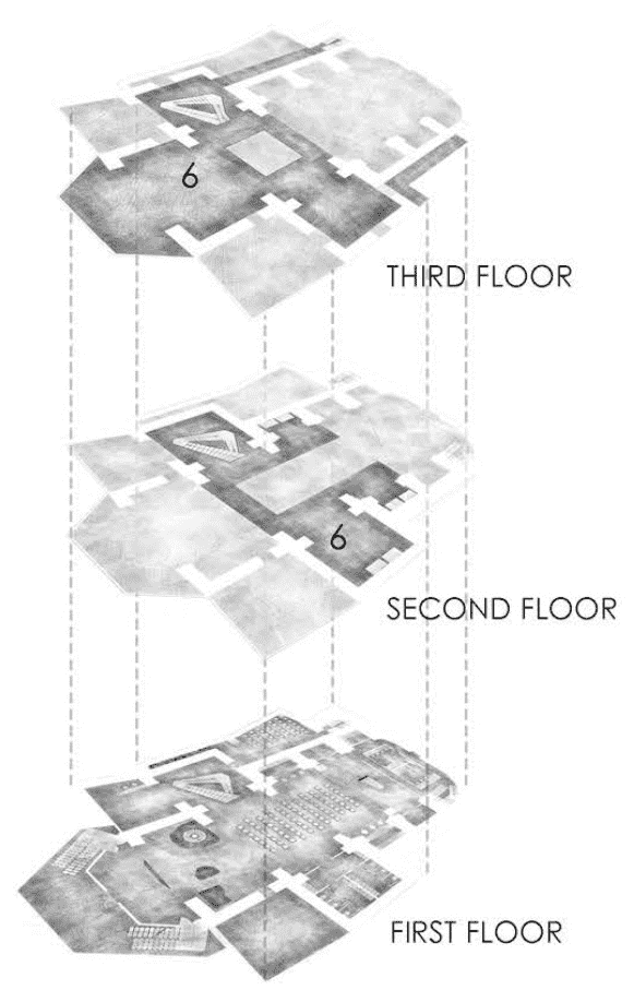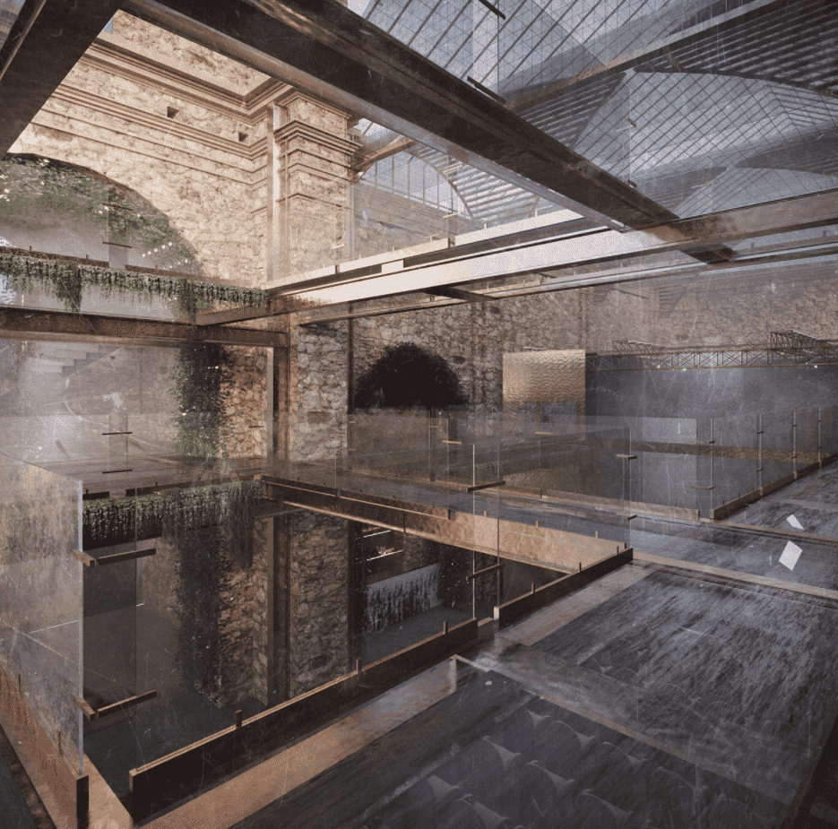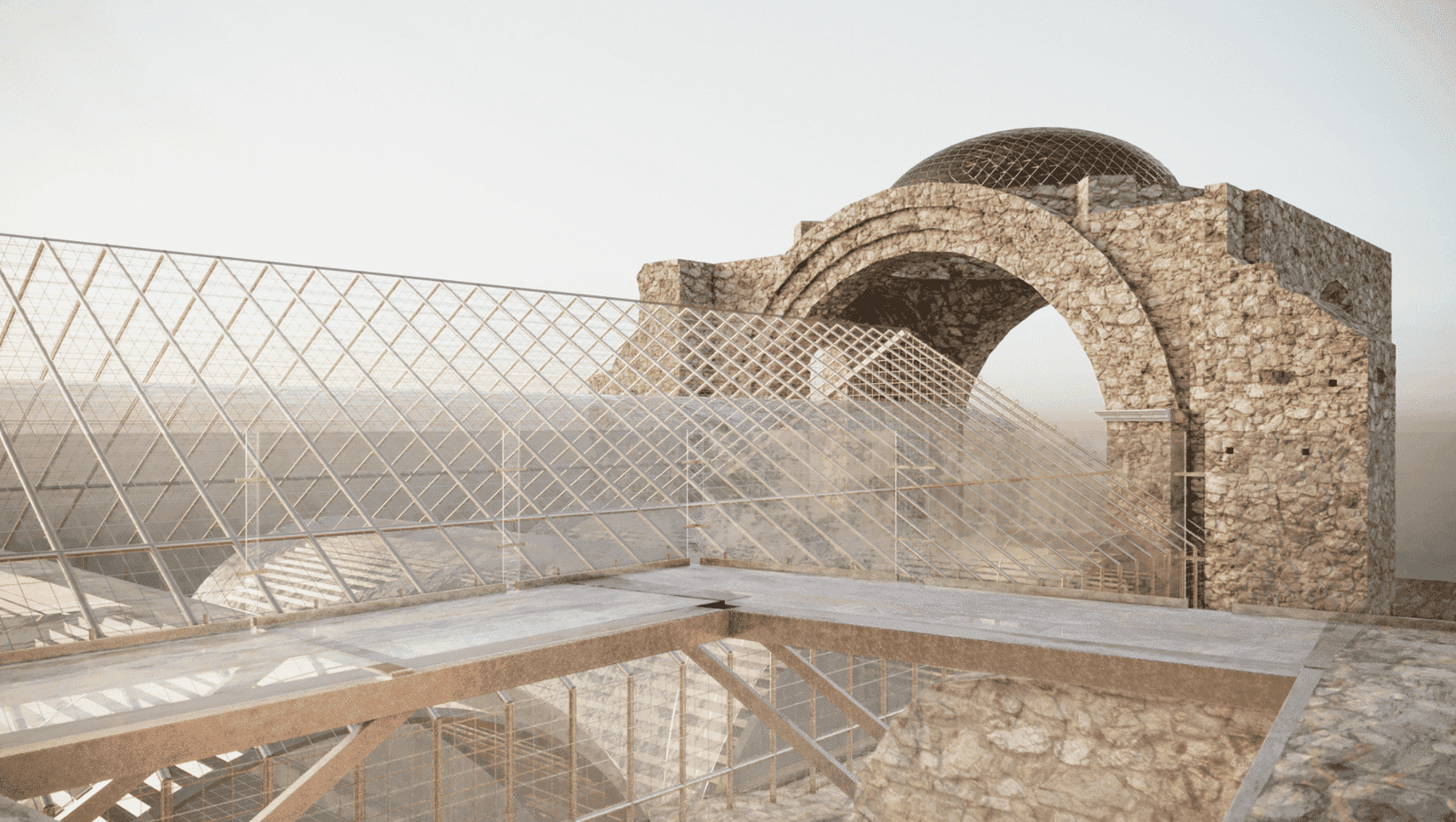 The idea consists of regenerating the space and preserving the spirit of the place of the Italian town. We chose the method of devizualization of the new architecture, using translucent and reflective planars. They complete the look of the church, by standing in the background and giving all the attention to the authentic church. Thus, the new construction become a "ghost building" because of using glass to create the effect of dissolving into space, and filling the pause in the context of the urban space. All the main ruined parts - the roof, the walls, vaults, and arches became visible again but now only in the glass and copper to show the contrast of old and new but in the same time to save the essence of “genius loci”.