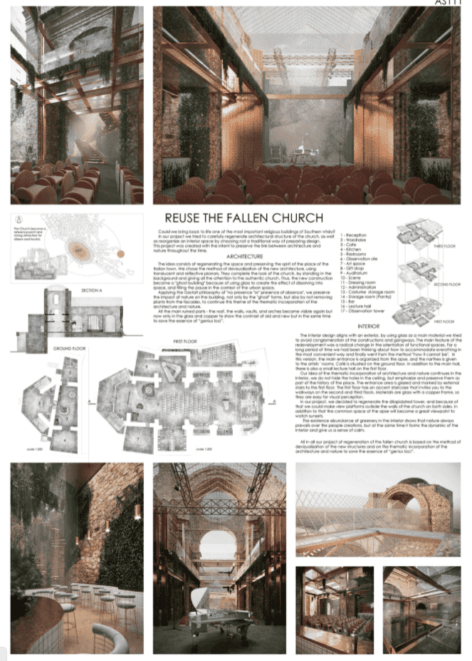 In our project we tried to carefully regenerate architectural structure of the church, as well as reorganize an interior space by choosing not a traditional way of preparing design. This project was created with the intent to preserve the link between architecture and nature throughout the time.